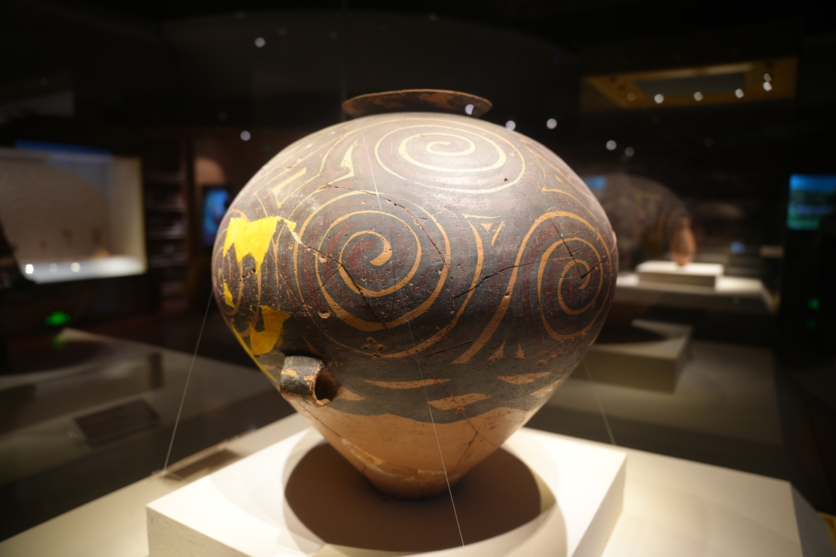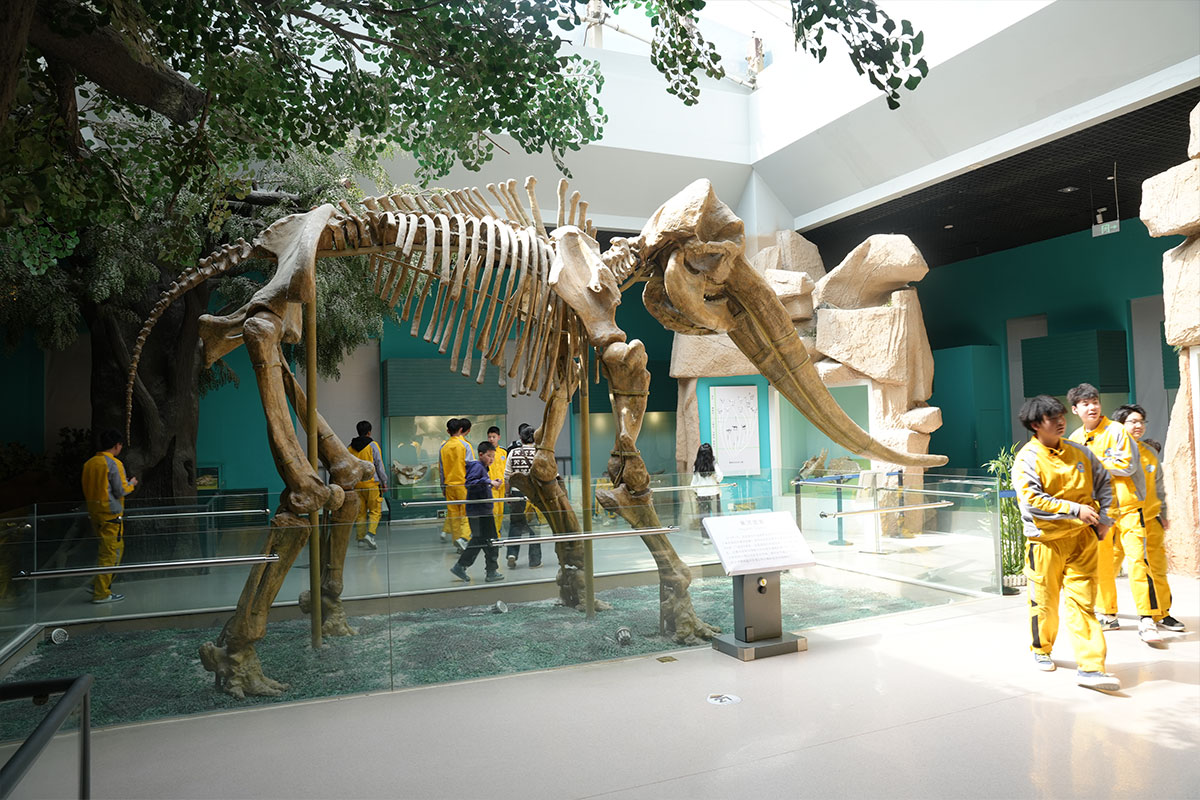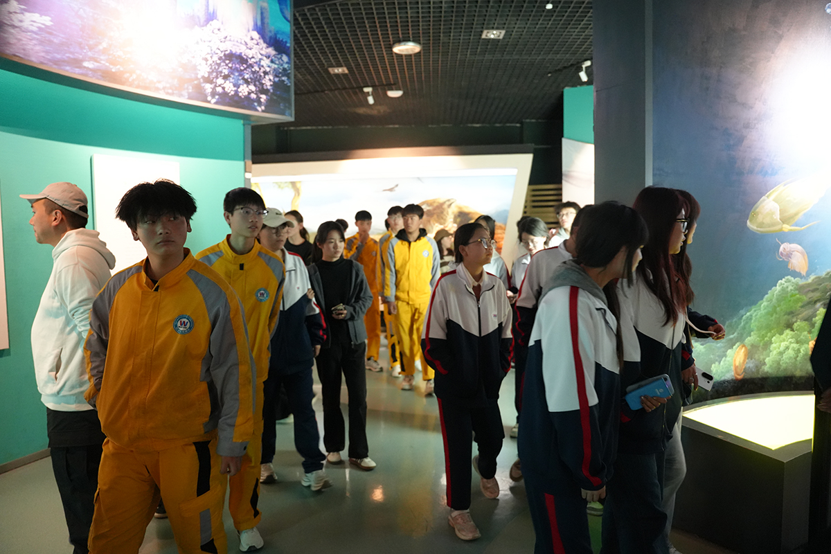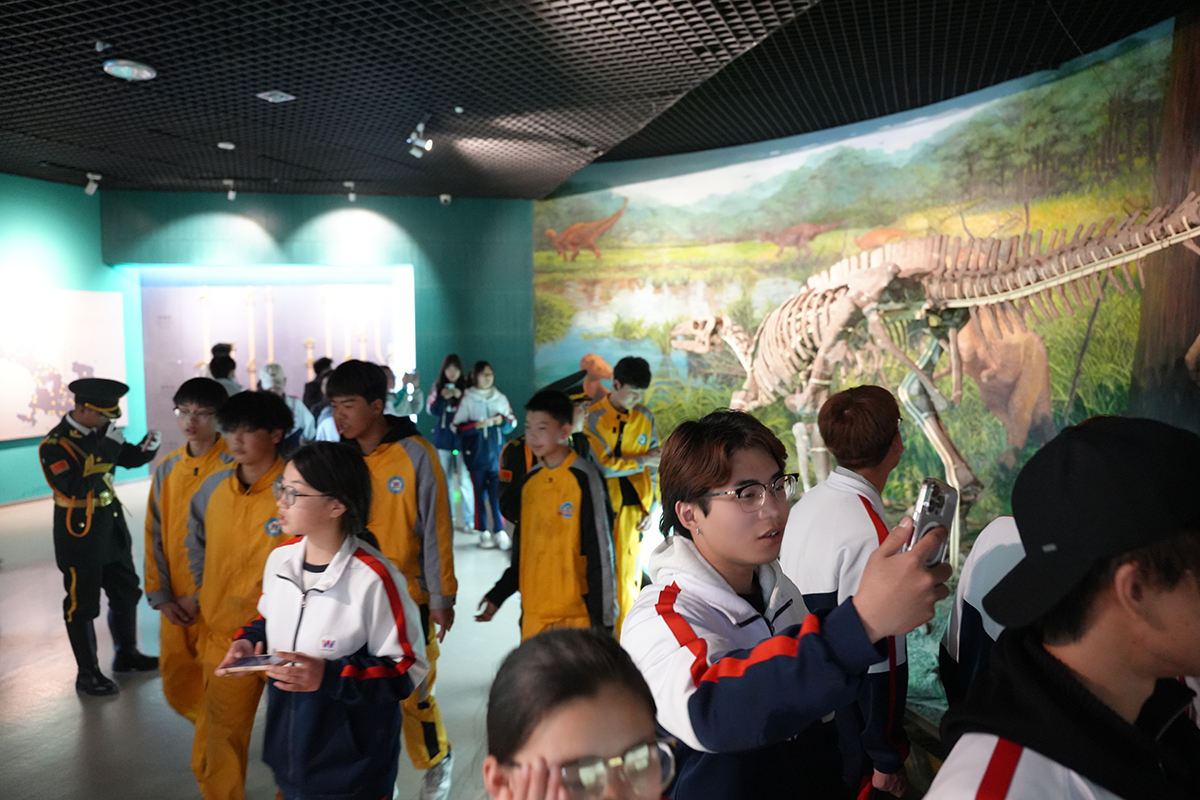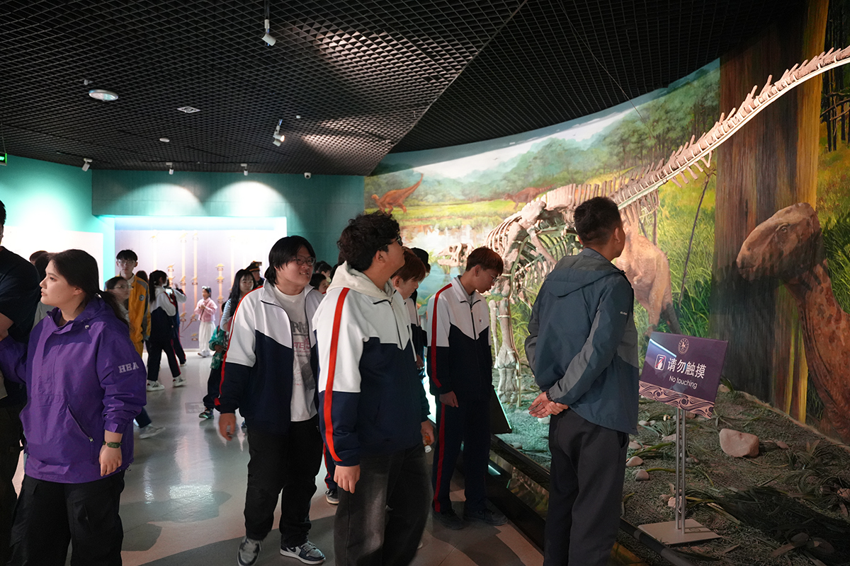 甘肃省博物馆馆藏文物8万余件,时间跨度长达八千年。在讲解员的引导下,师生们依次参观了甘肃彩陶、丝绸之路文明、古生物化石、红色甘肃等核心展厅。面对镇馆之宝“铜奔马(马踏飞燕)”,大家纷纷惊叹于汉代青铜艺术的巅峰造诣;在人头形器口彩陶瓶、鲵鱼纹彩陶瓶前,师生们近距离触摸远古先民的智慧与审美;驻足于驿使图画像砖前,同学们读懂了丝路邮驿的千年脉络;在黄河古象与恐龙化石展厅,大家则感受到地球生命的壮阔演化历程。